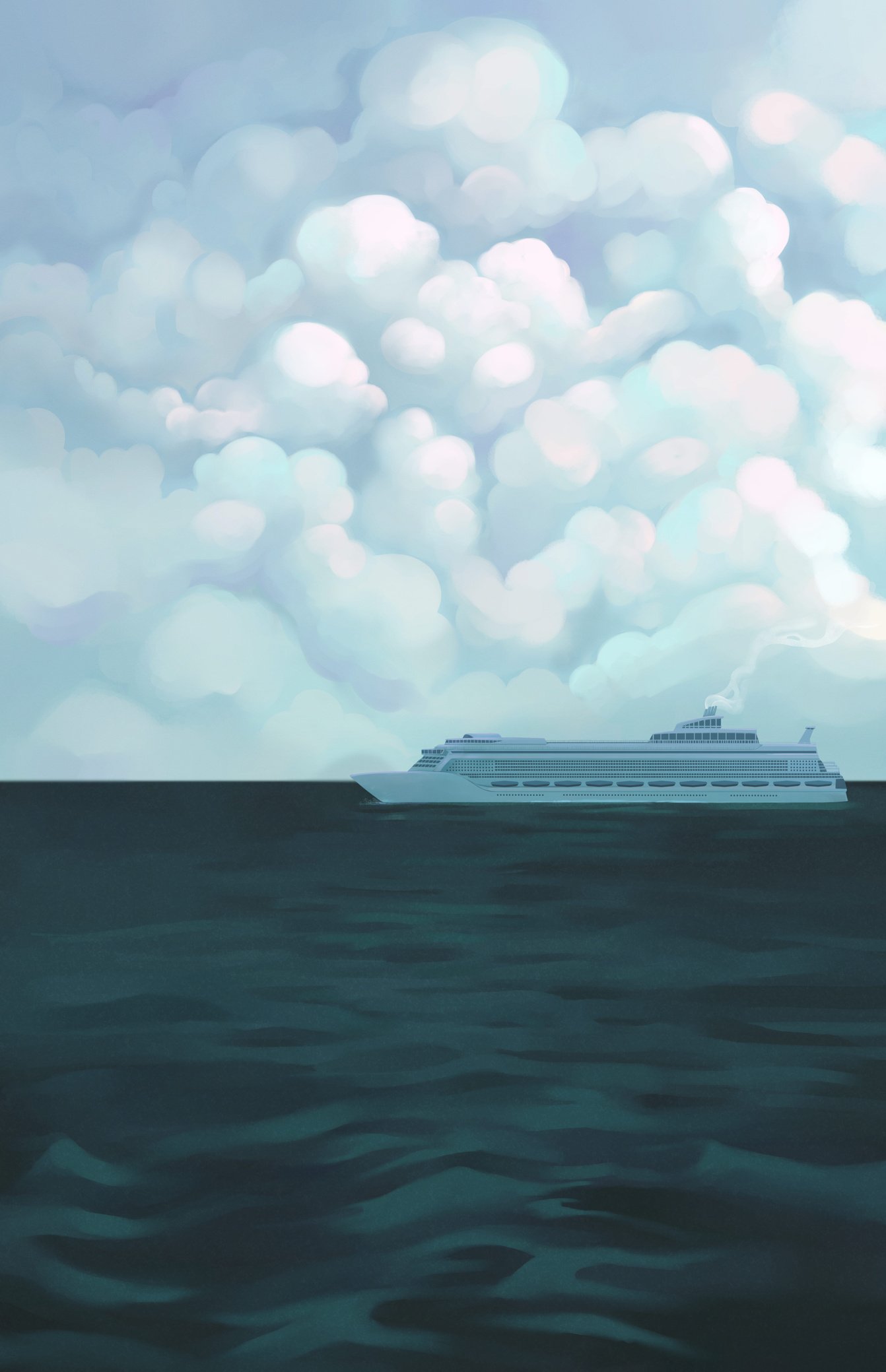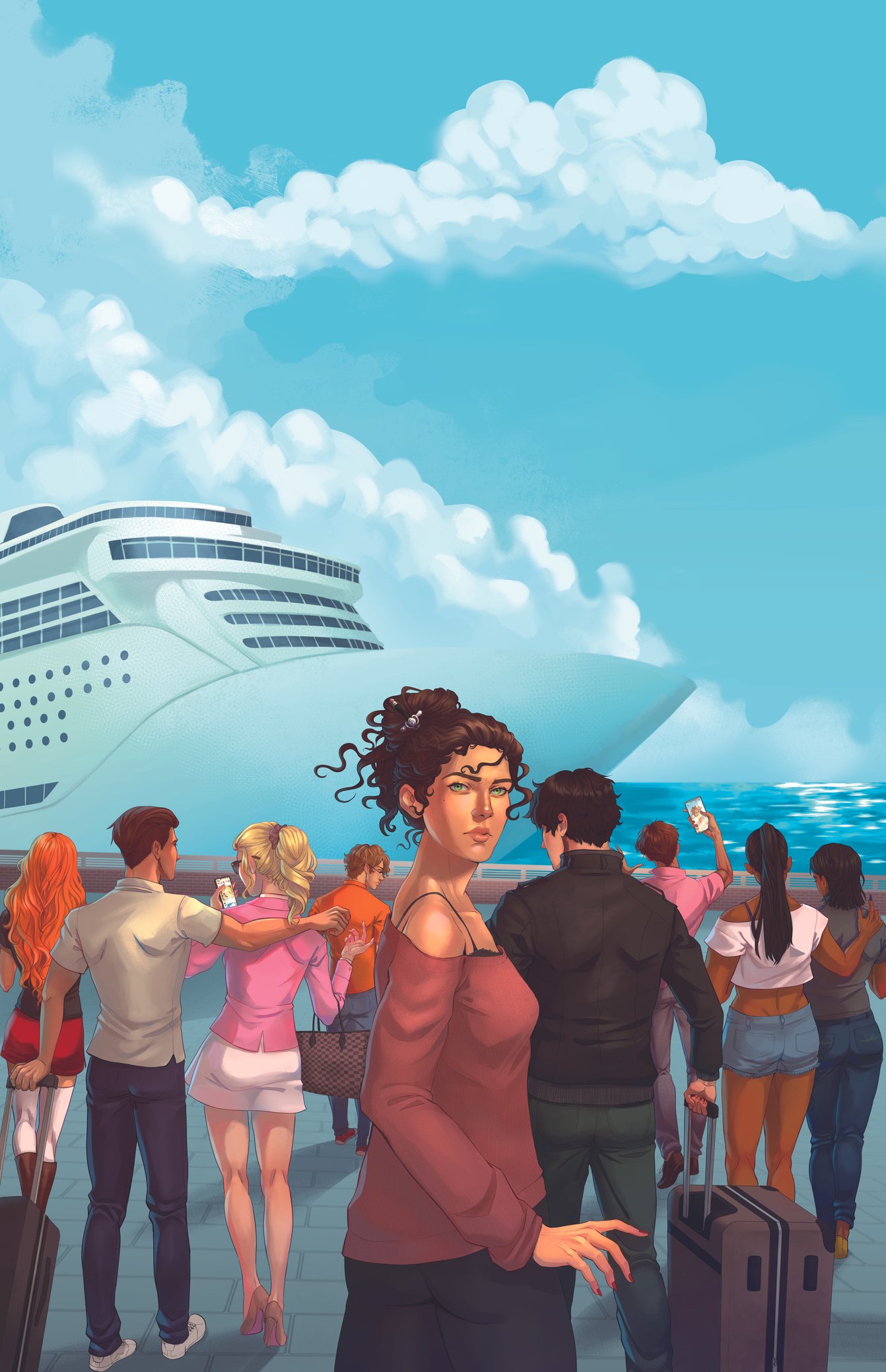 Es una novela juvenil de misterio, donde ocurre un crimen y todos los personajes tienen algo que ocultar, por eso decidí que estuvieran todos de espalda al espectador, caminando a la entrada del barco.